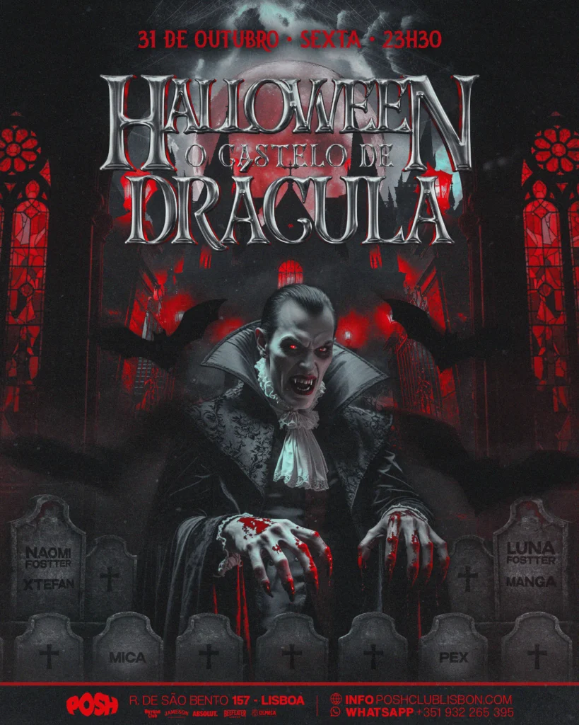 O Halloween da POSH Club Lisboa ganhou uma versão lendária com o tema “O Castelo de Drácula” — uma noite sombria, teatral e sedutoramente macabra. A identidade visual do evento mergulha na estética clássica do cinema gótico, misturando luxo e terror vintage com uma pegada contemporânea.
